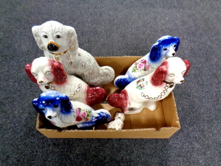 A box containing two pairs of Staffordshire spaniels together with two further Staffordshire spaniels