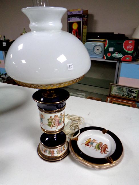 An Italian ceramic lamp with glass shade and matching ash tray