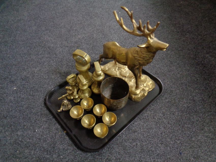 A tray containing assorted brass ware to include figure of a stag, set of six graduated brass weights, eastern brass planter
