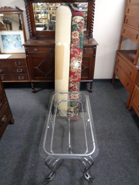 A contemporary metal glass topped coffee table together with two rolled woolen rugs
