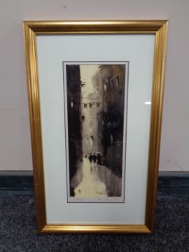 A contemporary oil, figures on a street, titled 'Barcelona', indistinctly signed, in a gilt frame