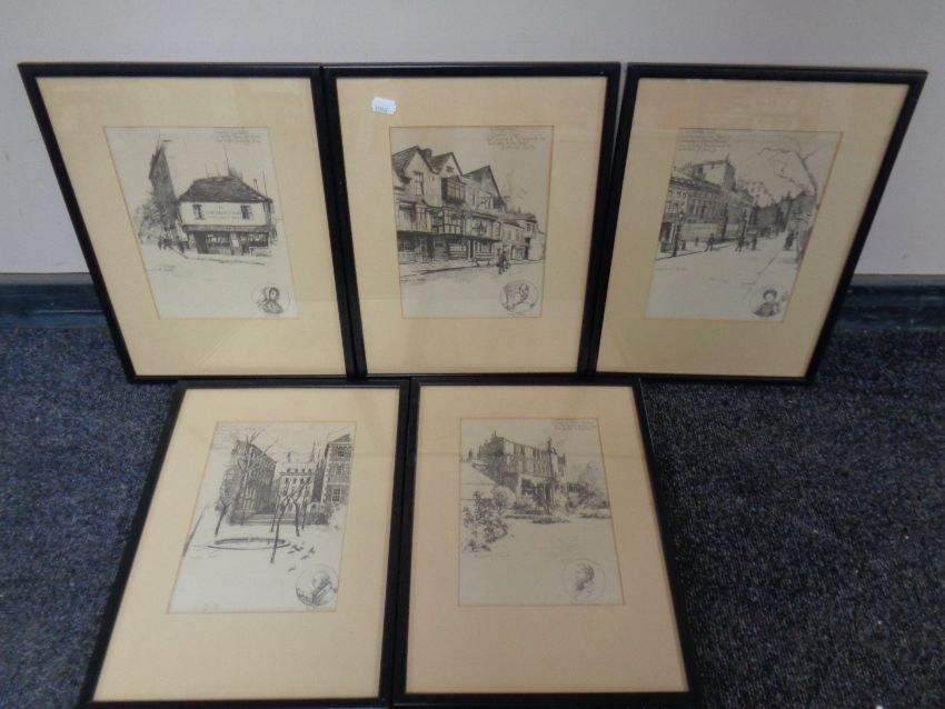 A set of five Marjorie Bates Dickens monochrome prints, framed