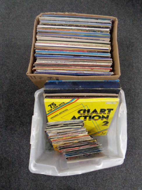 Two boxes containing a quantity of vinyl LPs and 7 inch singles, Genesis, Mike Oldfield, compilations, musicals etc
