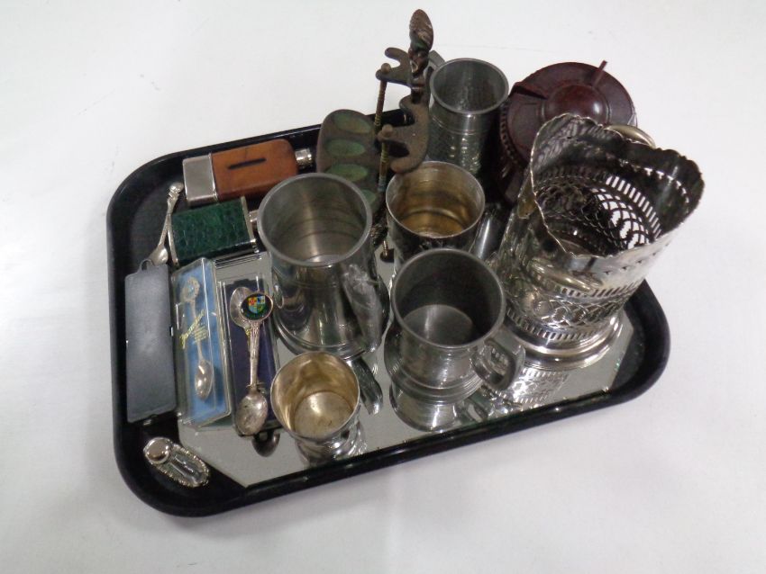A tray containing cast iron pipe stand, a Bakelite tea caddy, assorted plates wares, hip flasks, teaspoons etc