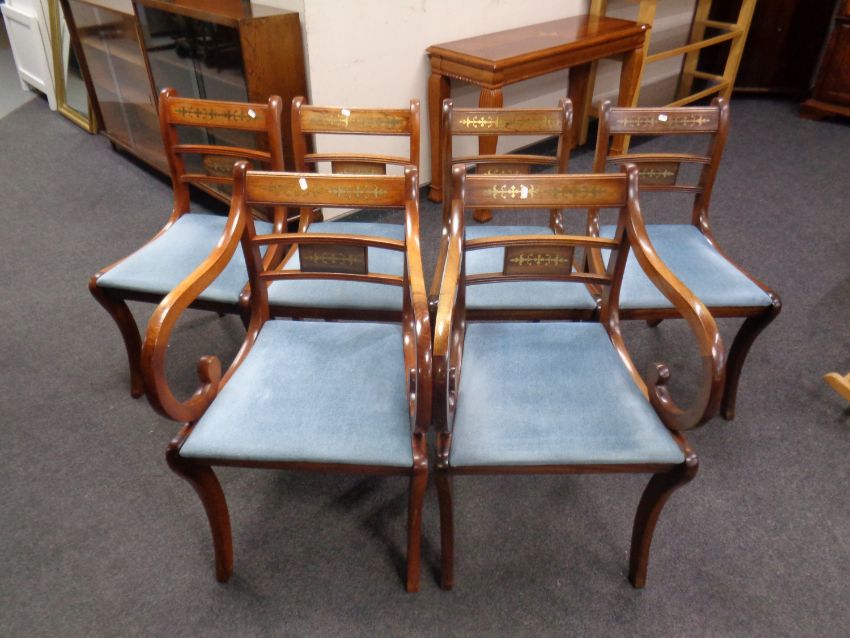 A set of six Reprodux brass inlaid chairs, two carvers, four singles (blue seats)