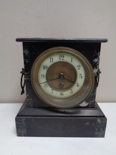 A 19th century marble and black slate mantel clock with brass and enamel dial