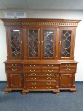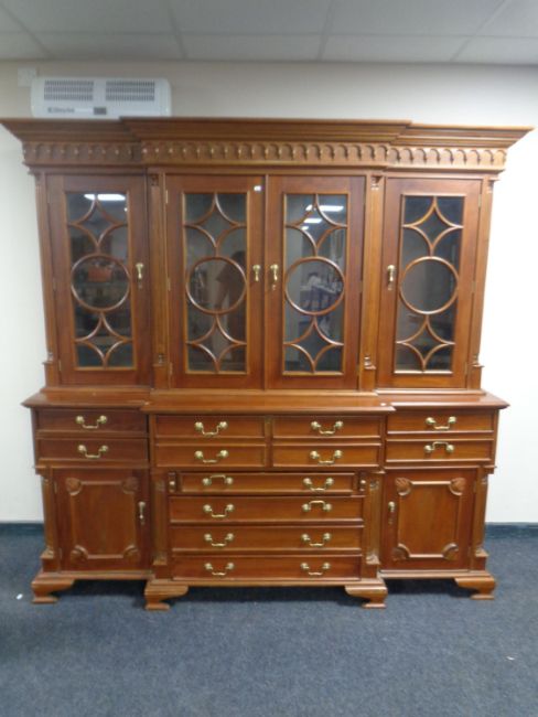 A reproduction Victorian style four door bookcase fitted secretaire cupboards and drawers beneath