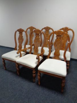 An American style twin pedestal extending dining table with two chairs together with a set of six carved dining chairs, two carvers, four singles