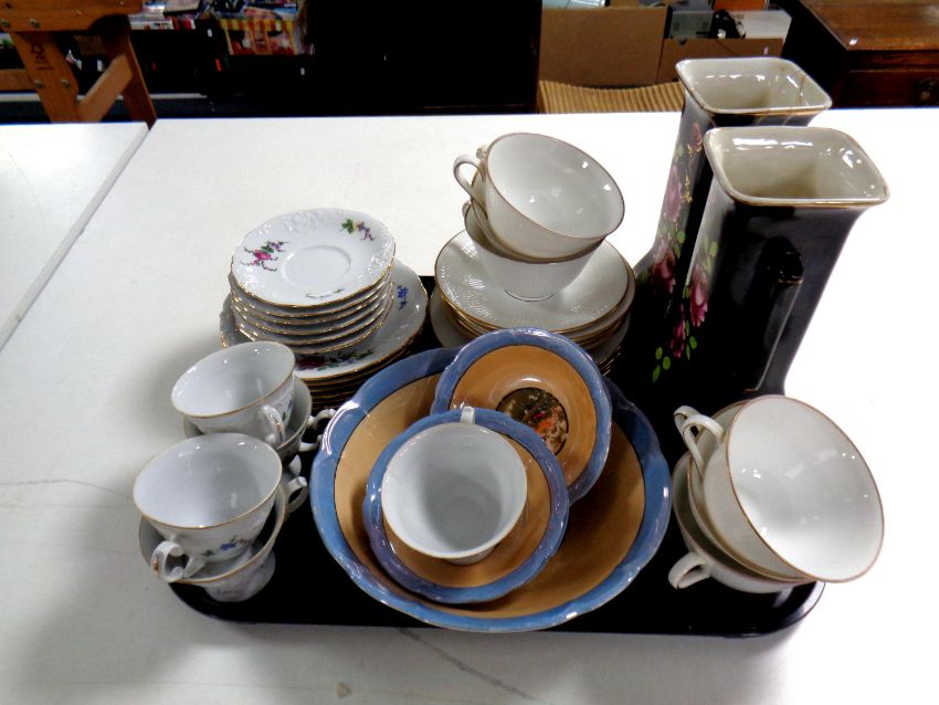 A tray containing miscellaneous ceramics to include a pair of transfer printed pottery vases (as found), a lustre dessert service, continental tea china