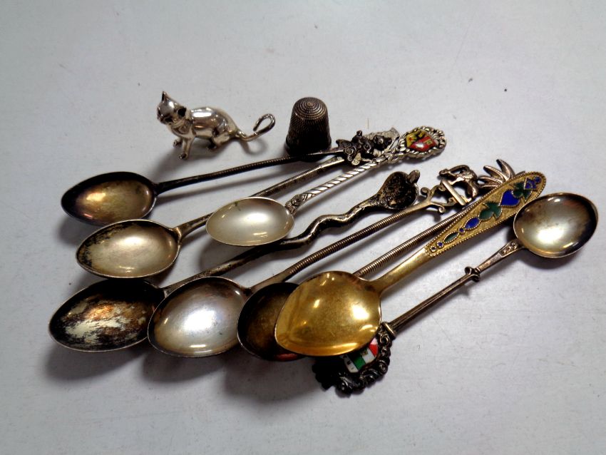 A box containing silver figure of a cat, silver thimble, together with eight assorted sterling continental and silver plated teaspoons