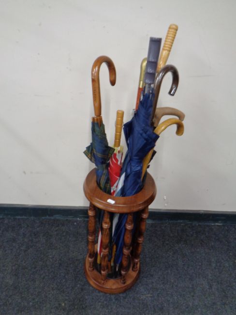 A beech wood stick stand containing a quantity of assorted walking sticks and umbrellas