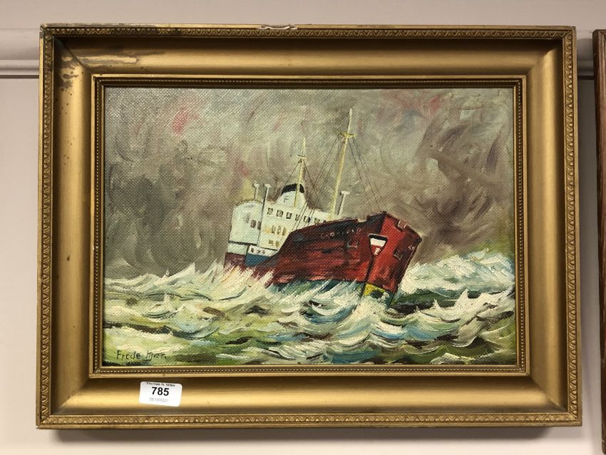 Continental school : Trawler in rough seas, oil on board, 39 x 26 cm