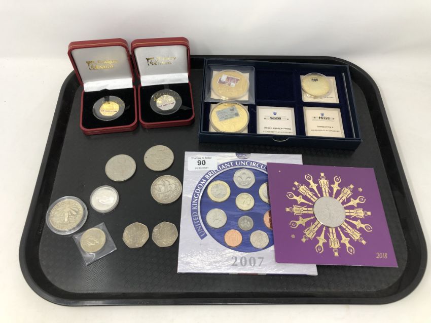A tray of coins including two Pobjoy Mint commemorative 50p pieces, 1935 crown, UK Uncirculated Coin Collection 2007, USA silver half dollar George Washington commemorative coin etc
