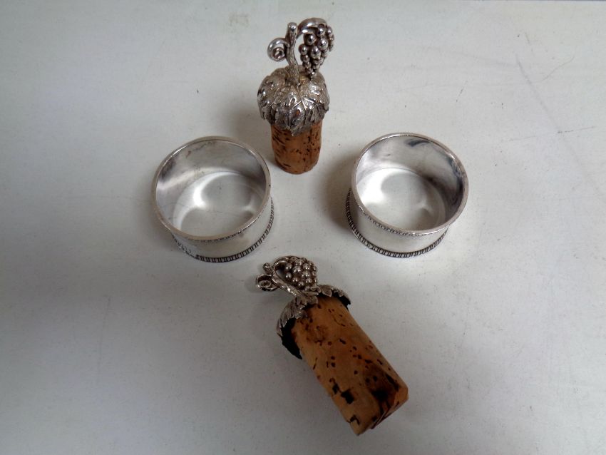 A pair of Sheffield silver napkin rings together with a pair of silver wine cork toppers