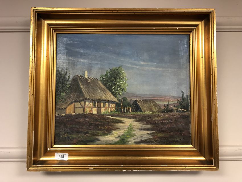 Continental school : A thatched cottage on moorland, oil on canvas, 40 x 33 cm