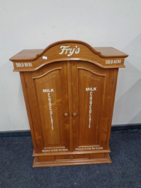 A pine double door cabinet fitted drawer beneath bearing Fry's advertisement