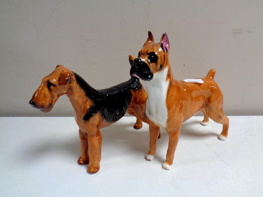 Two Royal Doulton figures of dogs, Boxer and an Airedale Terrier