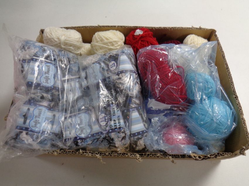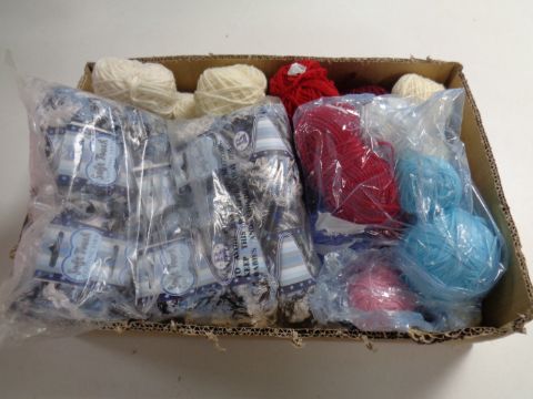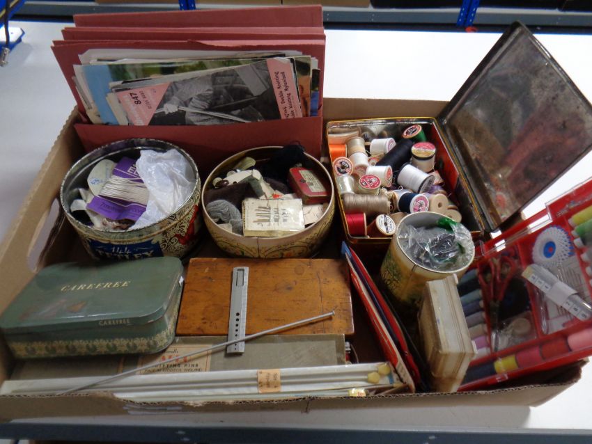 Two boxes containing haberdashery items, needles, threads, knitting patterns, knitting needles, wool etc