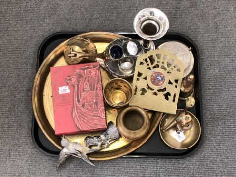 A tray containing brass and silver plated wares including circular serving tray, napkin rings, coasters, bells etc together with a boxed Norwegian pewter bowl