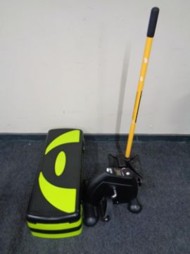 An AGM mini bike, an exercise stepper, together with a contractor's tamper square