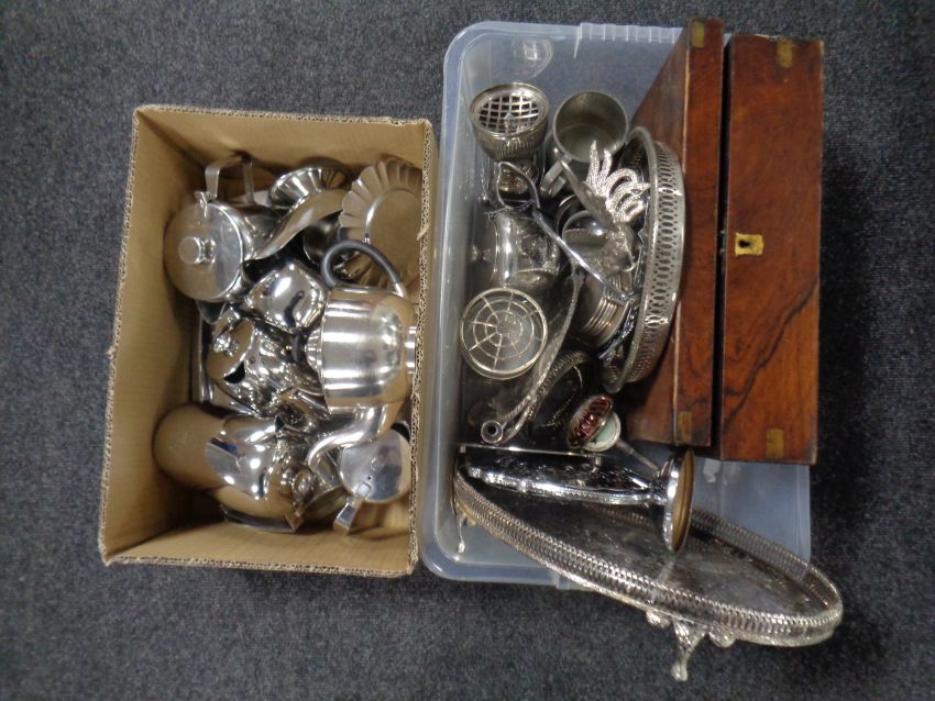 Two boxes containing a Victorian writing slope (as found) together with a large quantity of assorted plated and stainless steel wares