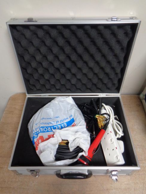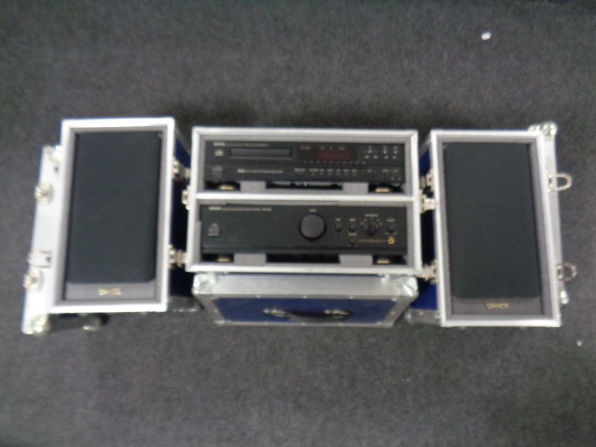 A Denon compact disc player DCD-715 together with a Denon integrated amplifier PMA-100M in flight case, together with a pair of tannoy speakers in flight cases and a further aluminium case containing assorted electrical wiring and extension lead