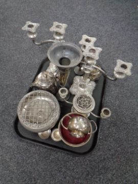 A tray containing antique and later plated wares to include table candelabra, fluted vase, rose bowl, Sheffield plate tea ware