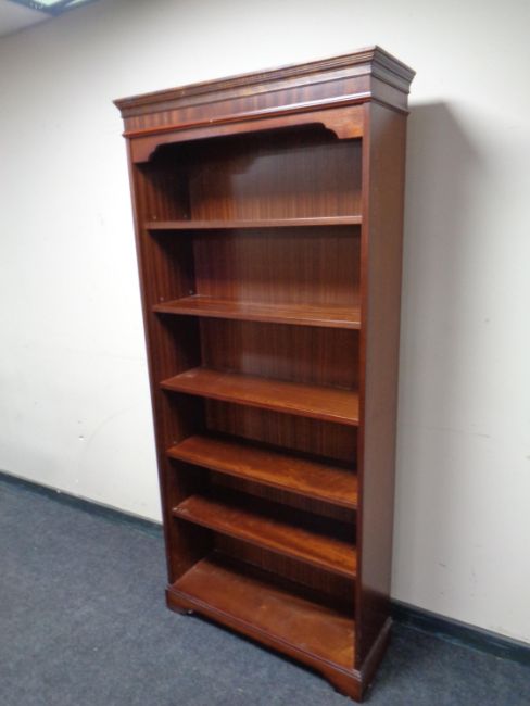 A set of open bookshelves in a mahogany finish