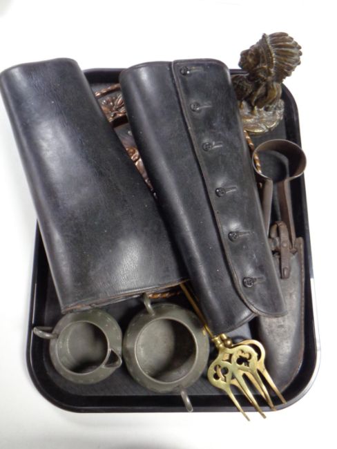 A tray containing pair of antique shears in leather case, heavy brass bookend, The Warrior, pewter tea ware, brass toasting forks etc