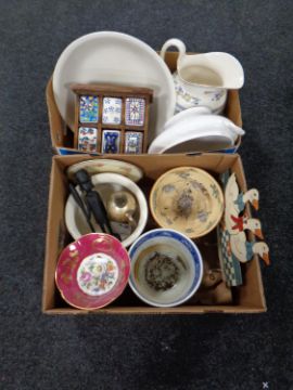 Two boxes containing assorted ceramics to include wash jug and basin, a Limoges comport, a Wedgwood fallow deer blue and white planter, wooden spice rack with ceramic drawers