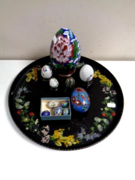 A circular papier mache tray together with eleven cloisonne eggs, five on wooden stands