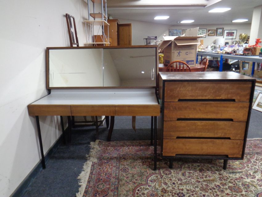 A mid 20th century stag furniture three drawer dressing table with storage mirror together with a similar four drawer chest