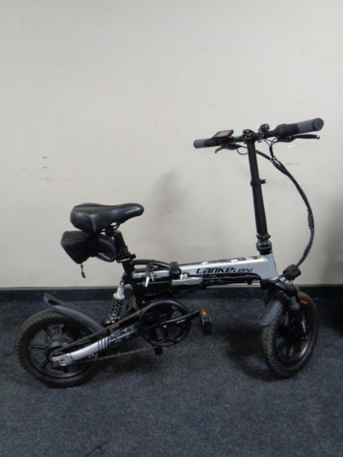 A Lankeleisi G100 folding e-bike with keys, charger and pump