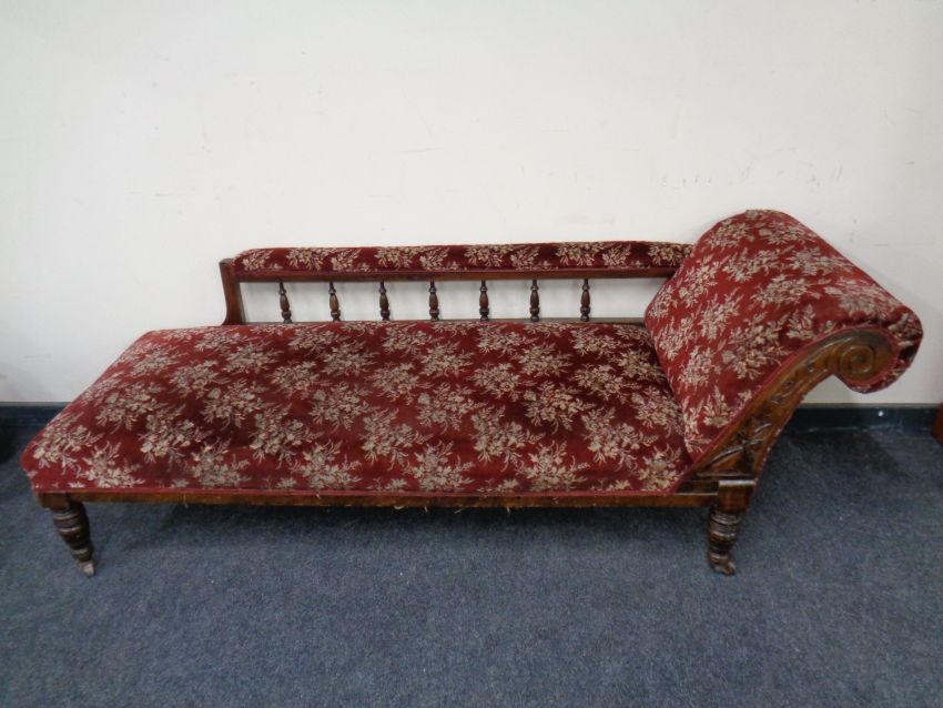 A 19th century chaise longue upholstered in a red floral fabric