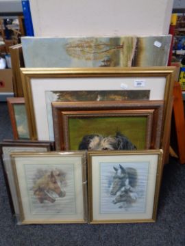 An oil on board of a dog by Harrison, dated 1984, together with an unframed oil on canvas and six further framed prints