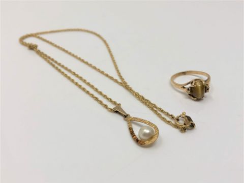 A gold pearl pendant on chain and a gold tiger's eye set ring (2)