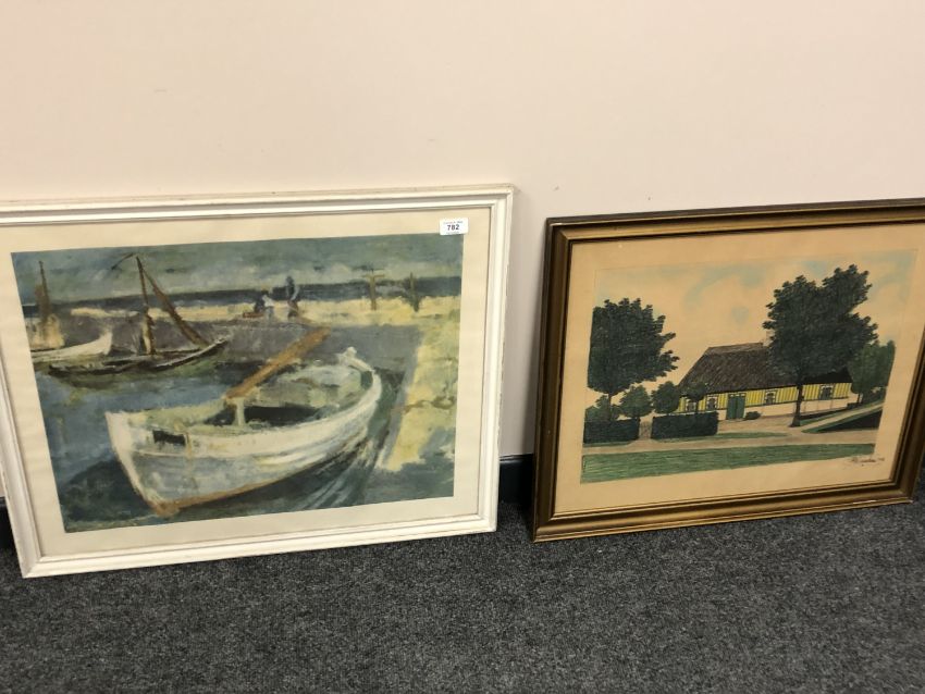 Two continental pictures depicting a rowing boat and a thatched building (2)