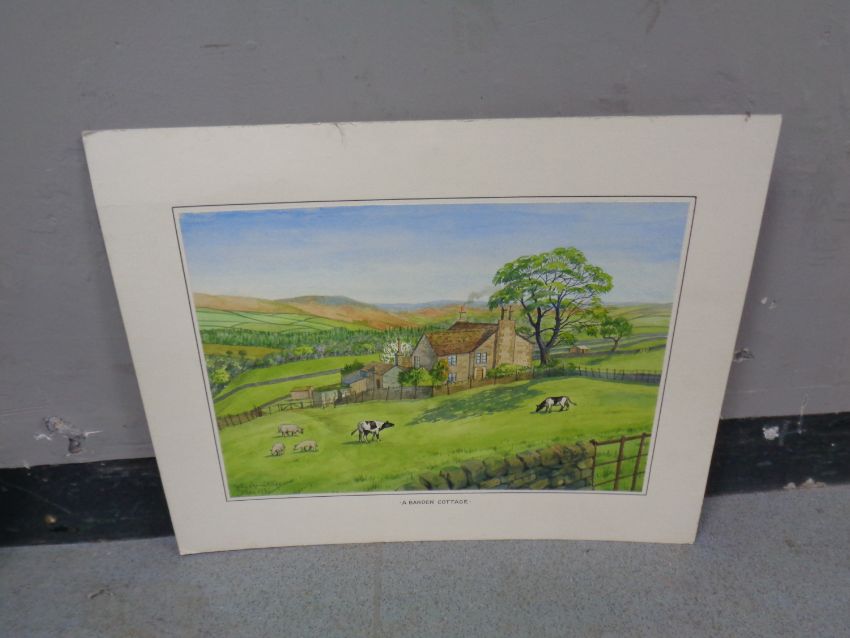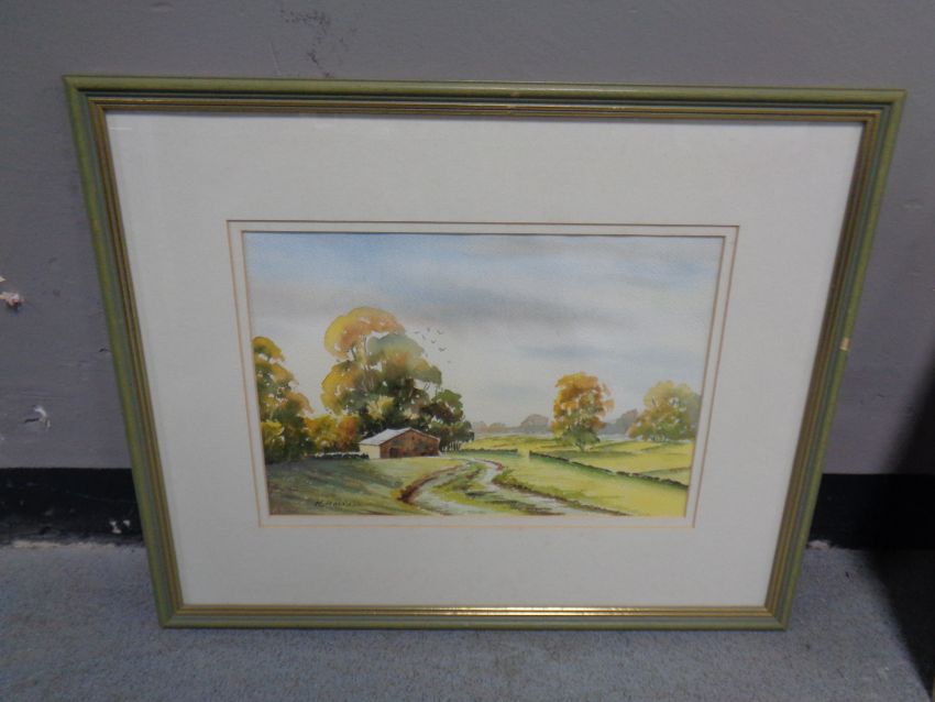 M Harrison, rural landscape, watercolour, 54cm by 44cm. Together with a John Armitage (1900-1976) watercolour , A Barden Cottage, North Yorkshire, 40cm by 28cm, unframed. (2)