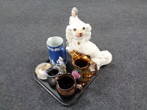A tray containing antique and later ceramics to include a Staffordshire figure of Havlock, Staffordshire dog, a Wedgwood blue and white Jasperware jug, copper lustre jug etc