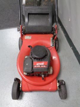 A MTD petrol self drive lawn mower with grass box