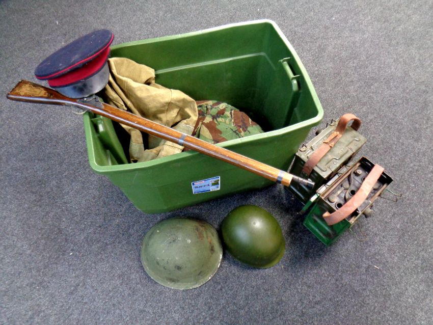 A box containing a large quantity of militaria including helmets, metal ammunition box, large inert bullet, buttons, cap, ornamental rifle etc