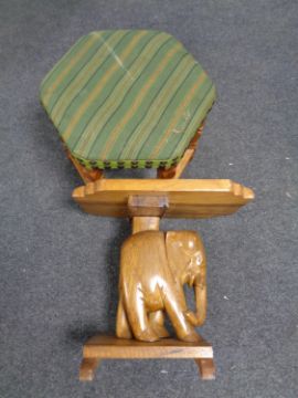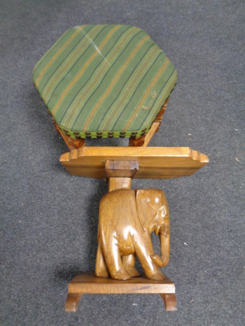 A mahogany flap sided table together with a stool and an elephant plant stand