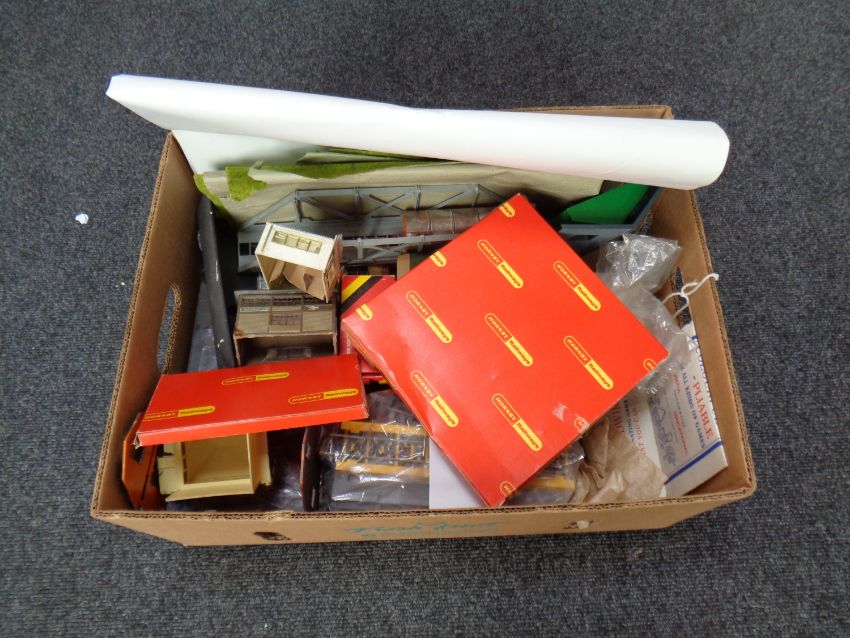 A box containing a collection of model railway accessories including buildings, scenery etc