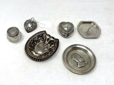 Six items of silver to include three small dishes, heart shaped trinket pot, a hinged clip and a small glass pot