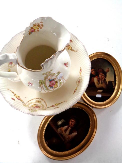 An Edwardian jug and basin together with a pair of continental gilt framed pictures depicting figures in a tavern