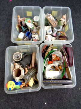 Four plastic tubs containing miscellaneous including 20th century pottery and glassware, Cameo editions postcard books etc