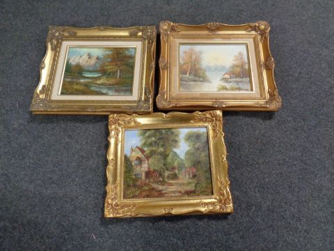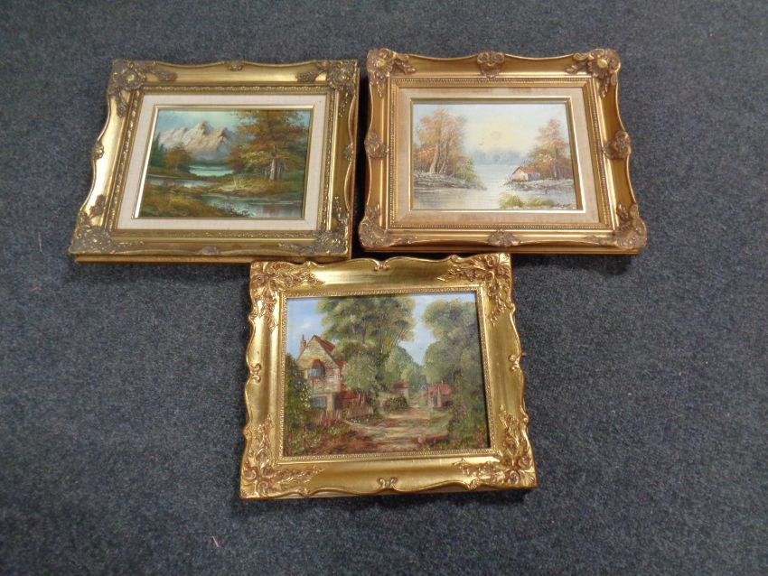 Three gilt framed oil paintings depicting landscapes and buildings