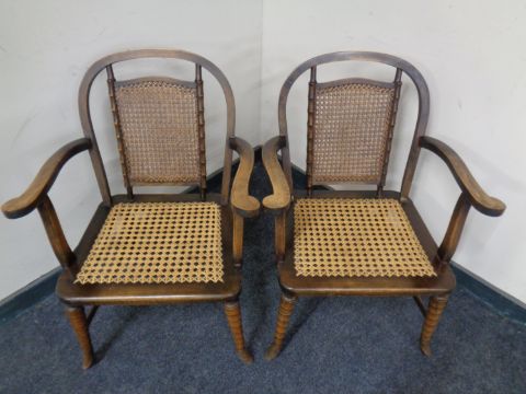 A pair of early 20th century stained beech and bergere armchairs with simulated bamboo frames