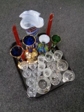 A tray containing 20th century glassware to include Venetian glass vase, hand painted gilded vases, liqueur glasses