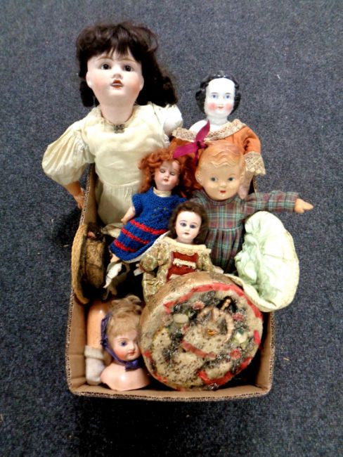 A box containing antique and later dolls including French bisque headed jointed doll etc